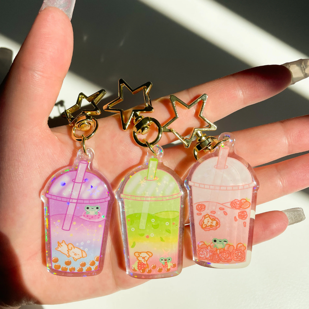 These three keychains are designed to be shared between a group of 2-3 friends, family, or loved ones. These keychains are still super cute as individual keychains. The keychains show Brownie and Timmy in three different boba teas: Strawberry Matcha tea, Purple Galaxy tea, and Rose Peach tea.