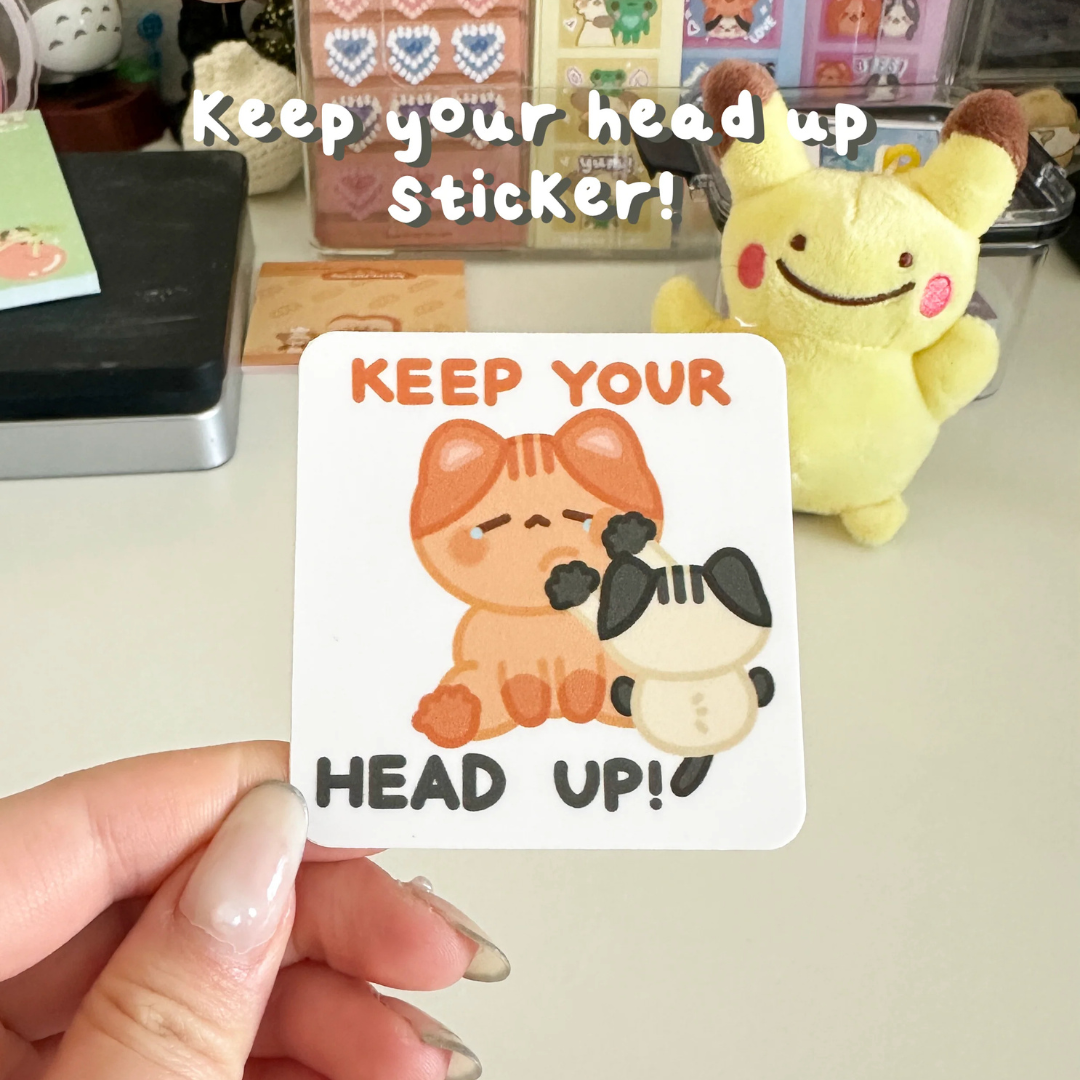 This sticker shows the black kitten holding the orange cat's head up to show their support and to cheer them up! This sticker is perfect to have as a reminder that you will get through whatever hardships you're going through and is perfect to gift someone that's going through a hard time!